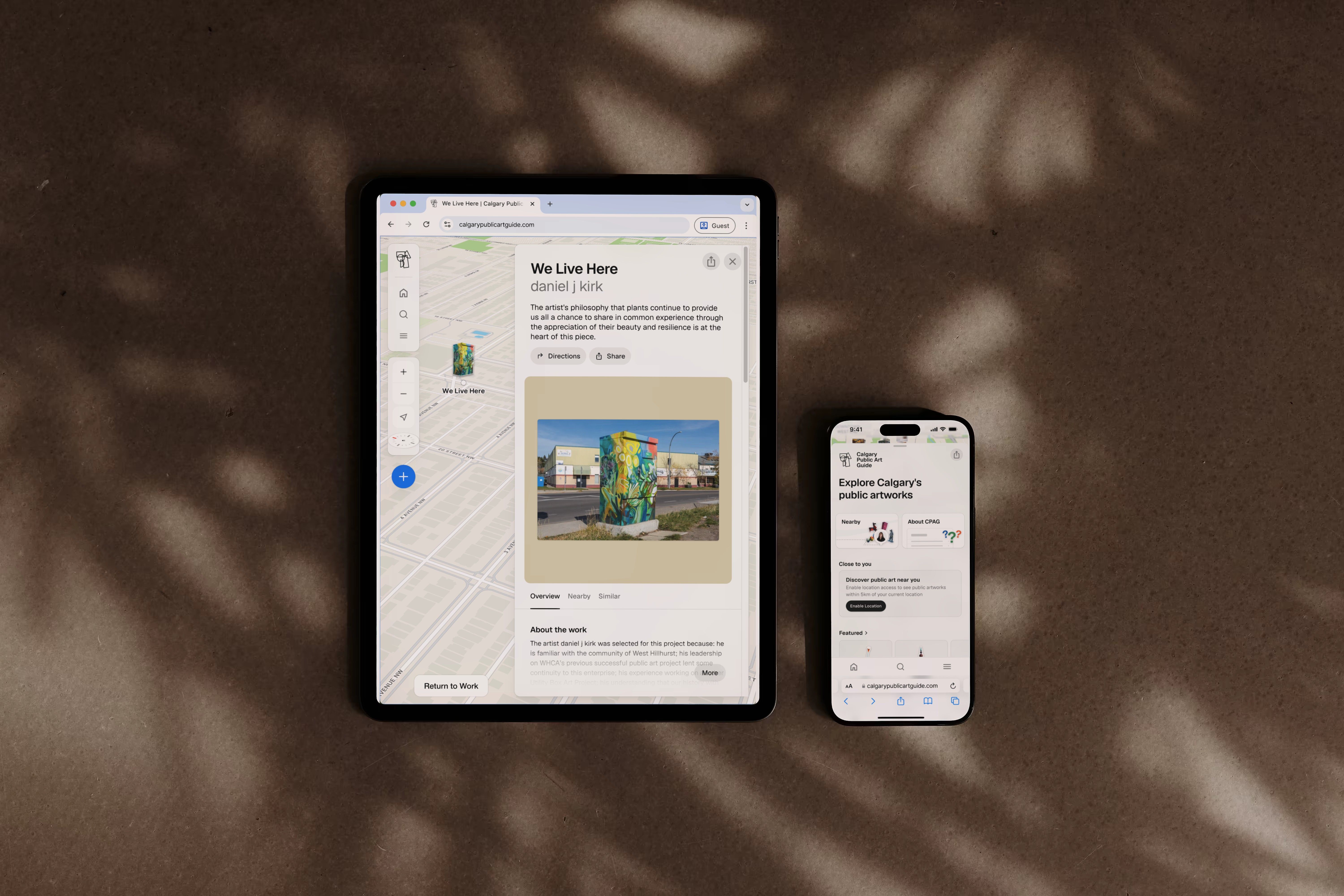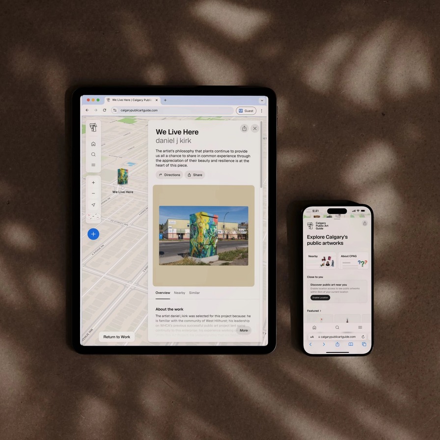 We built an interactive map that puts Calgary's entire public art collection at users' fingertips. The platform features location-based browsing, detailed artist profiles, and multimedia content that deepens each artwork's story. Users can filter by artwork type, explore by theme, or create custom self-guided tours tailored to their interests. Behind the scenes, we integrated Calgary's Open Data API with a flexible Sanity-based content management system, giving Calgary Arts Development the ability to continuously update and expand the guide while maintaining full control over content and imagery.