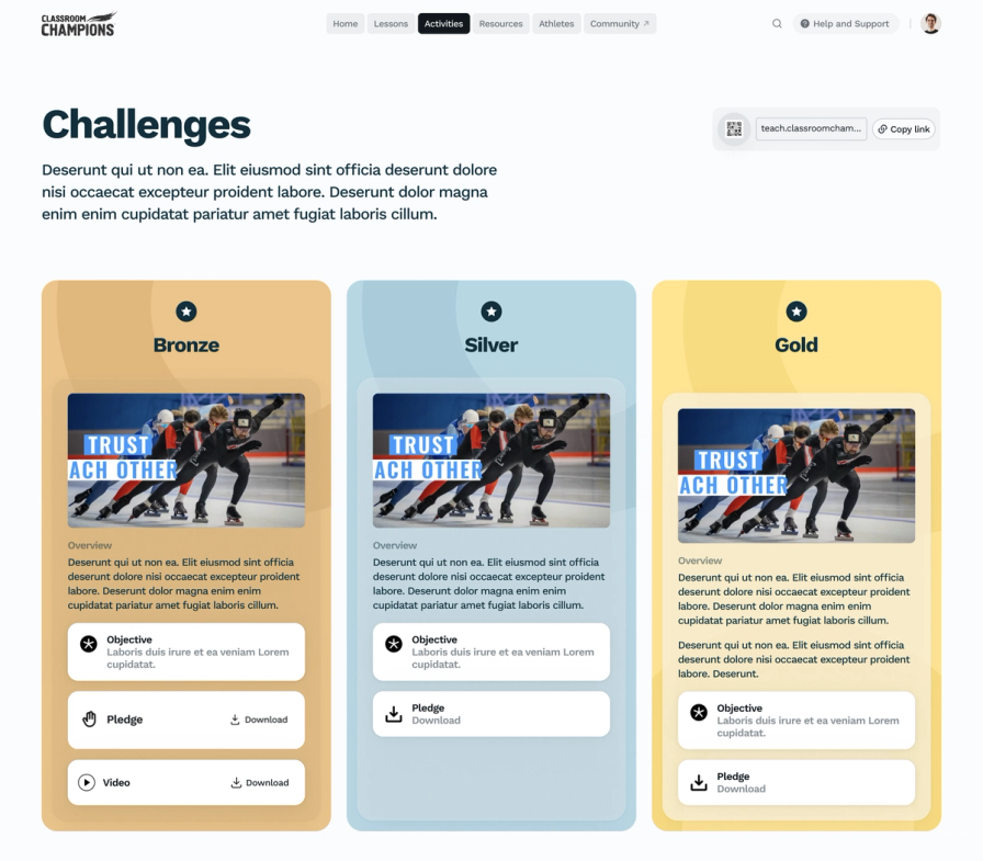 Tracking progress is central to how teachers use the platform. Classes move through units at different paces, and educators need to know, at a glance, what's been completed and what's still ahead. We surfaced progression statistics directly on the dashboard, so that information is always present rather than buried in individual lesson views. We also designed a set of tiered challenge badges, in Gold, Silver, and Bronze, bringing a touch of the Olympic spirit that defines Classroom Champions into the interface itself.
