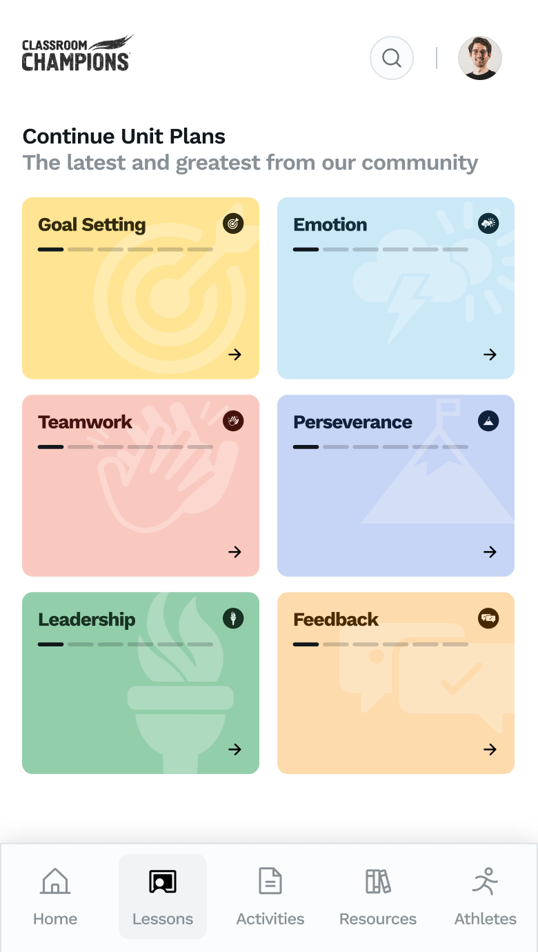 We approached the problem as one of clarity first. The card-based interface we designed makes it straightforward to browse lessons and units at a glance, pulling Classroom Champions' color palette into the experience to bring the dashboard in line with their public-facing brand.