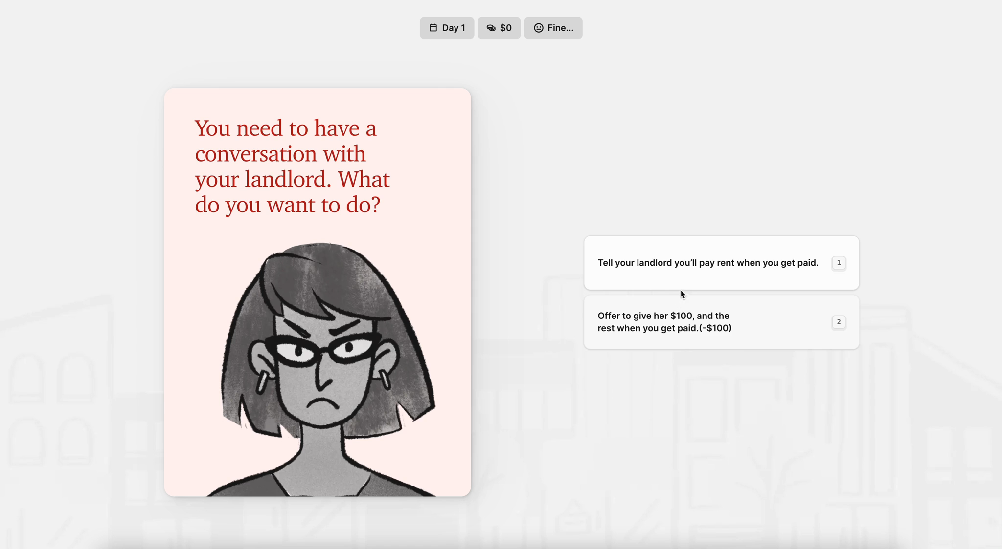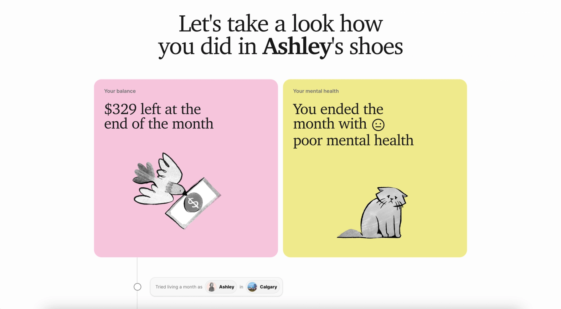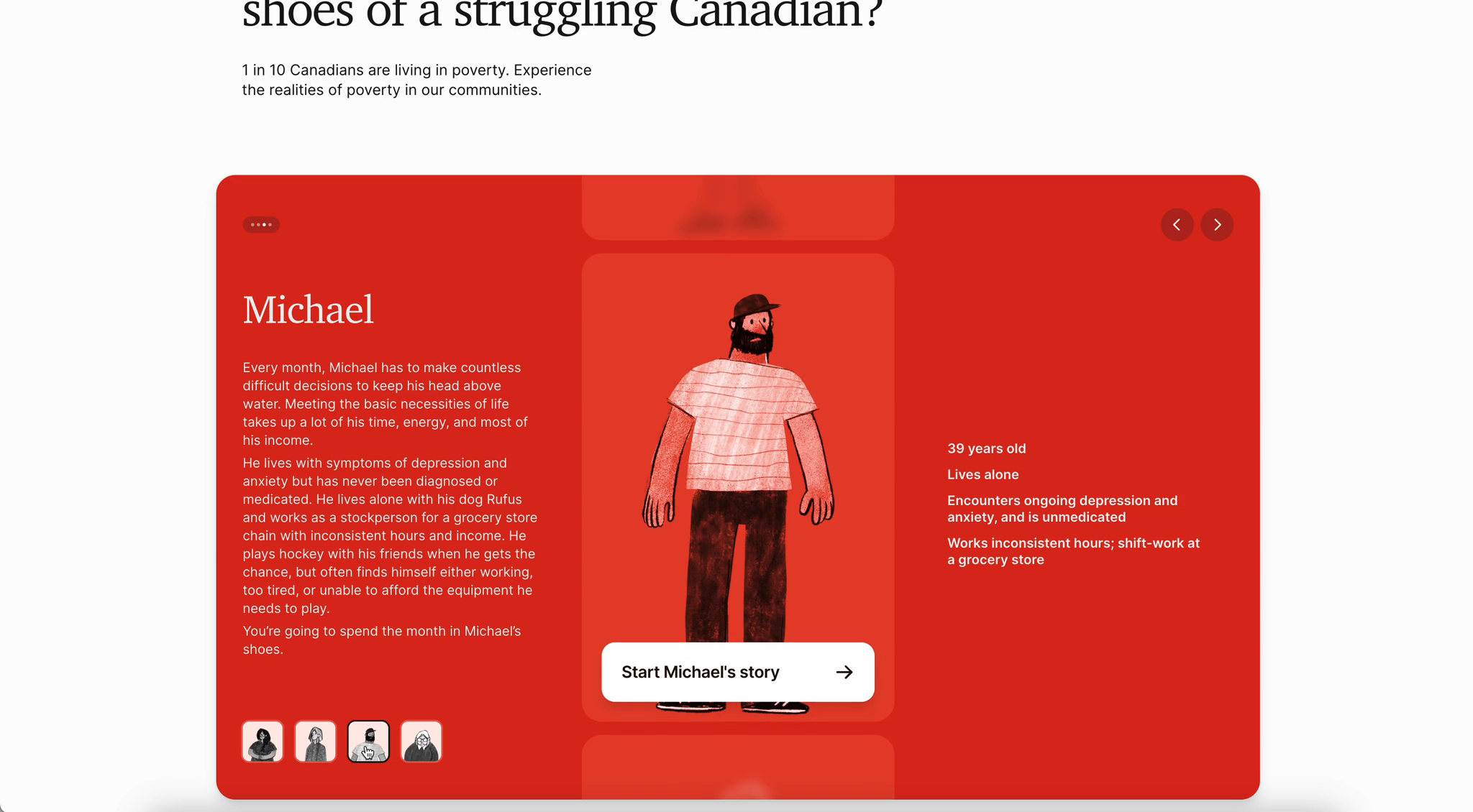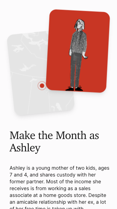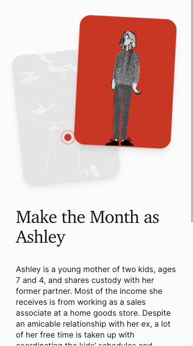 The experience takes the user through a full month in the life of someone living in poverty. They must make day-to-day decisions on how to allocate limited income while facing challenges around food insecurity, housing instability, health issues, family obligations and more. Each choice has an impact on their finances, relationships and overall wellbeing.