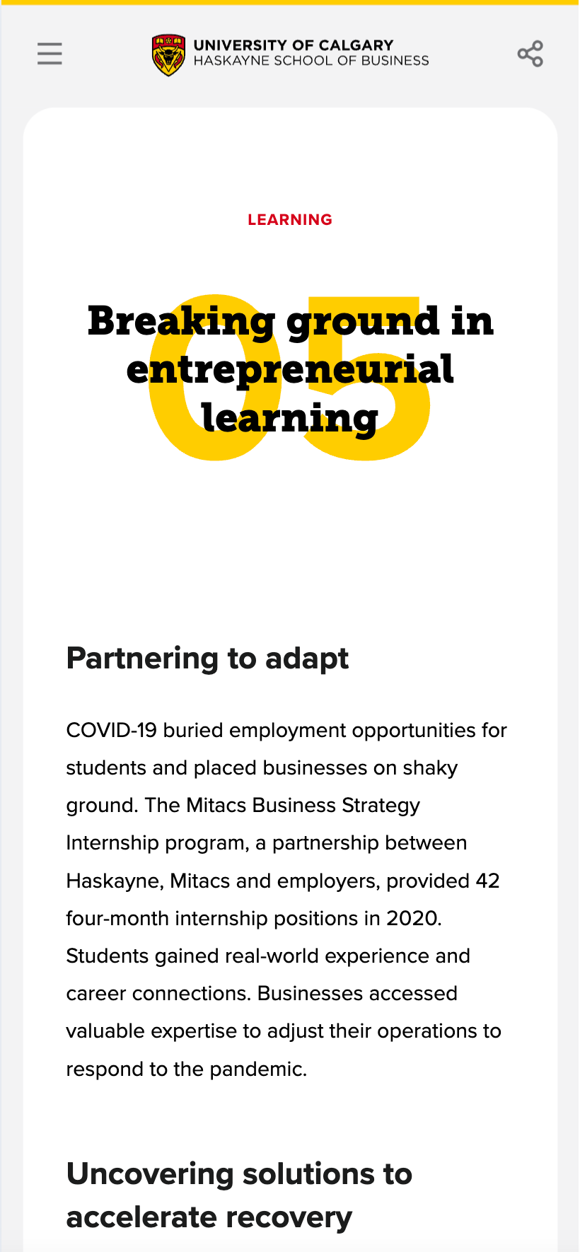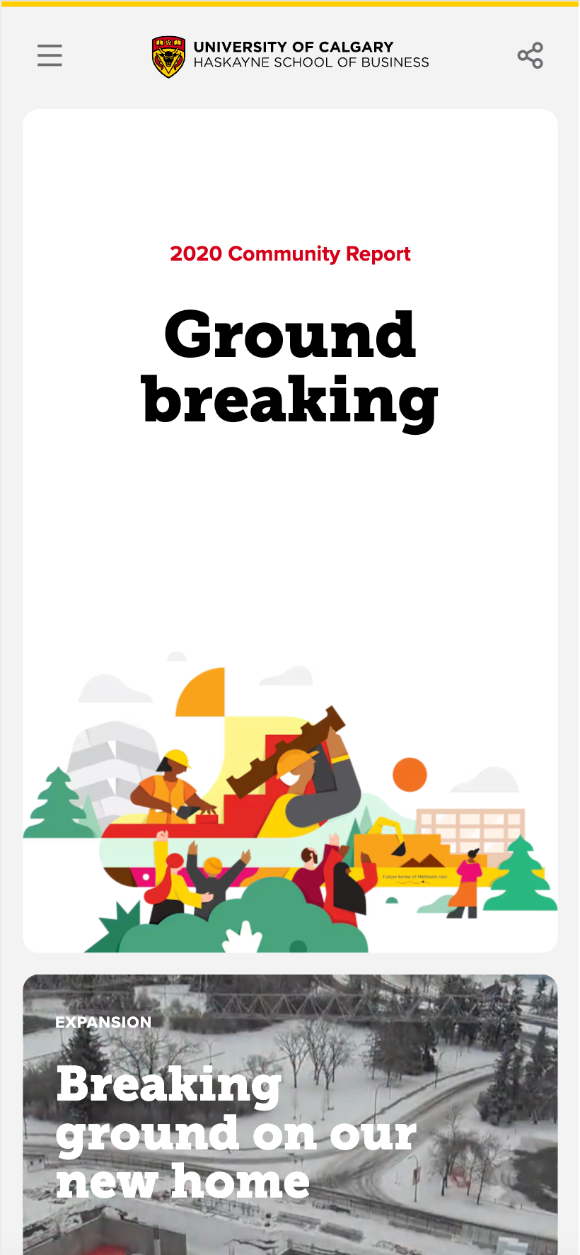 For their 2021 Annual Report, Haskayne School of Business’s team approached us with a challenge: they wanted to find a way to deliver their year-end story in a format that stakeholders would explore, not just skim.