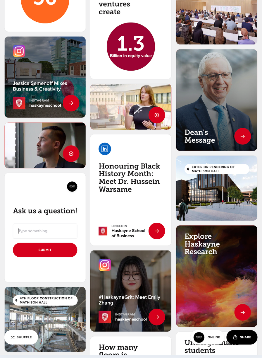 The volume of information wasn't an issue, as Haskayne’s content was well-organized and high quality. Working with the Haskayne team, we built their 2021 Annual Report as a web-based experience organized around a gallery-style layout, where content lives in discrete, visually distinct cards rather than continuous scrolling prose. Readers get an overview of the full report at a glance, then move into whichever areas are relevant to them. The structure respects that faculty members and prospective donors aren’t reading the report for the same reasons.