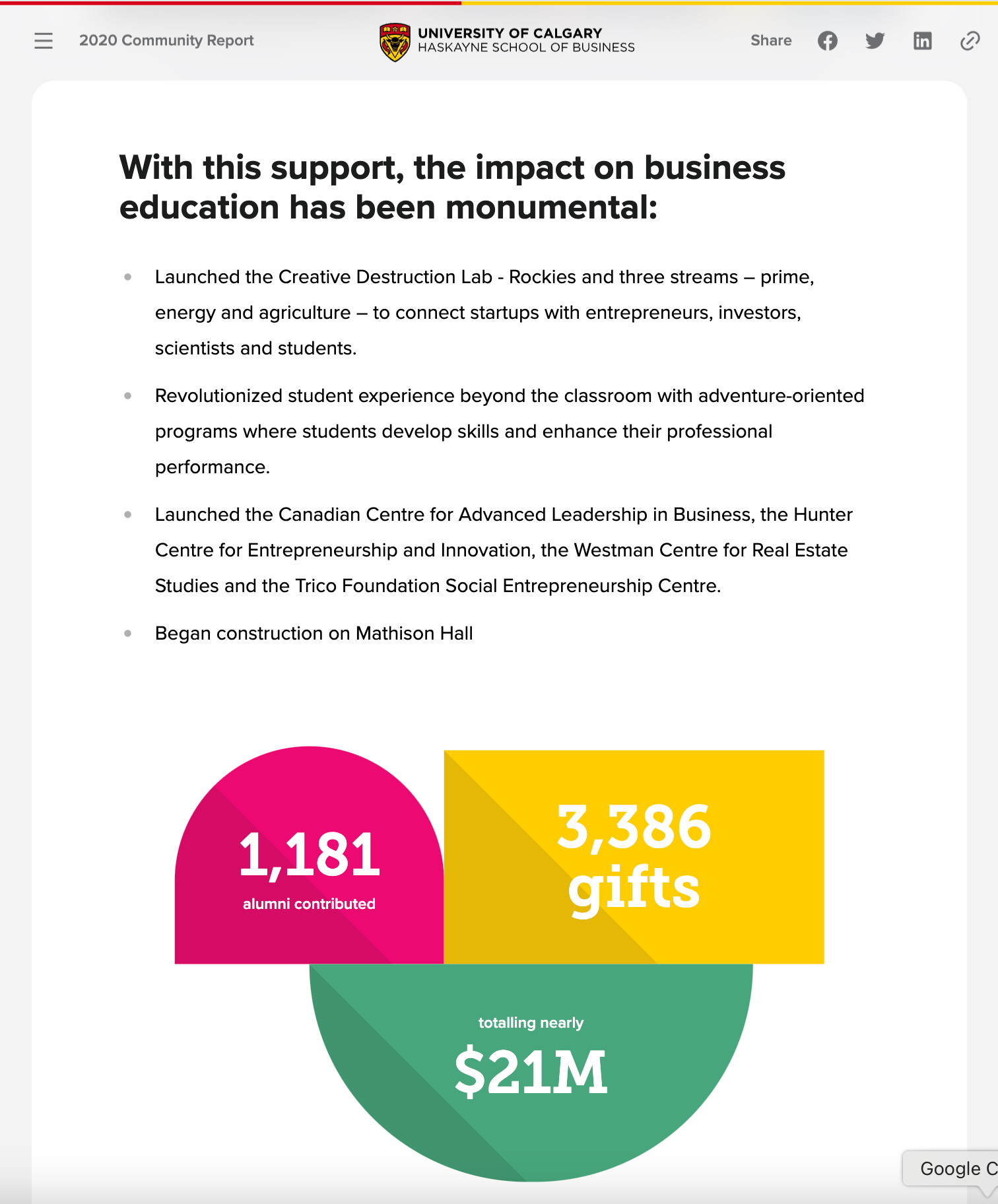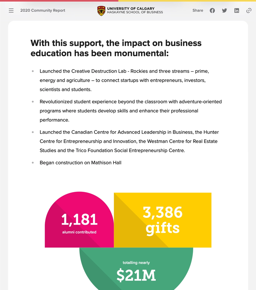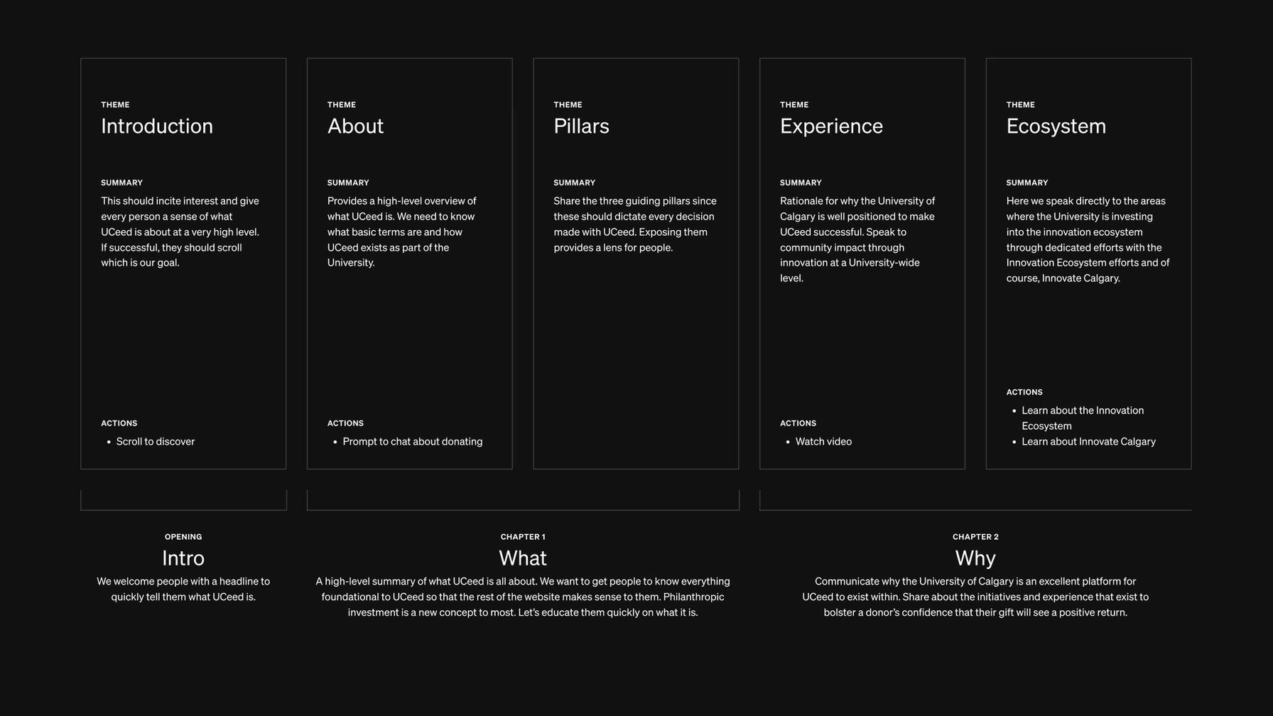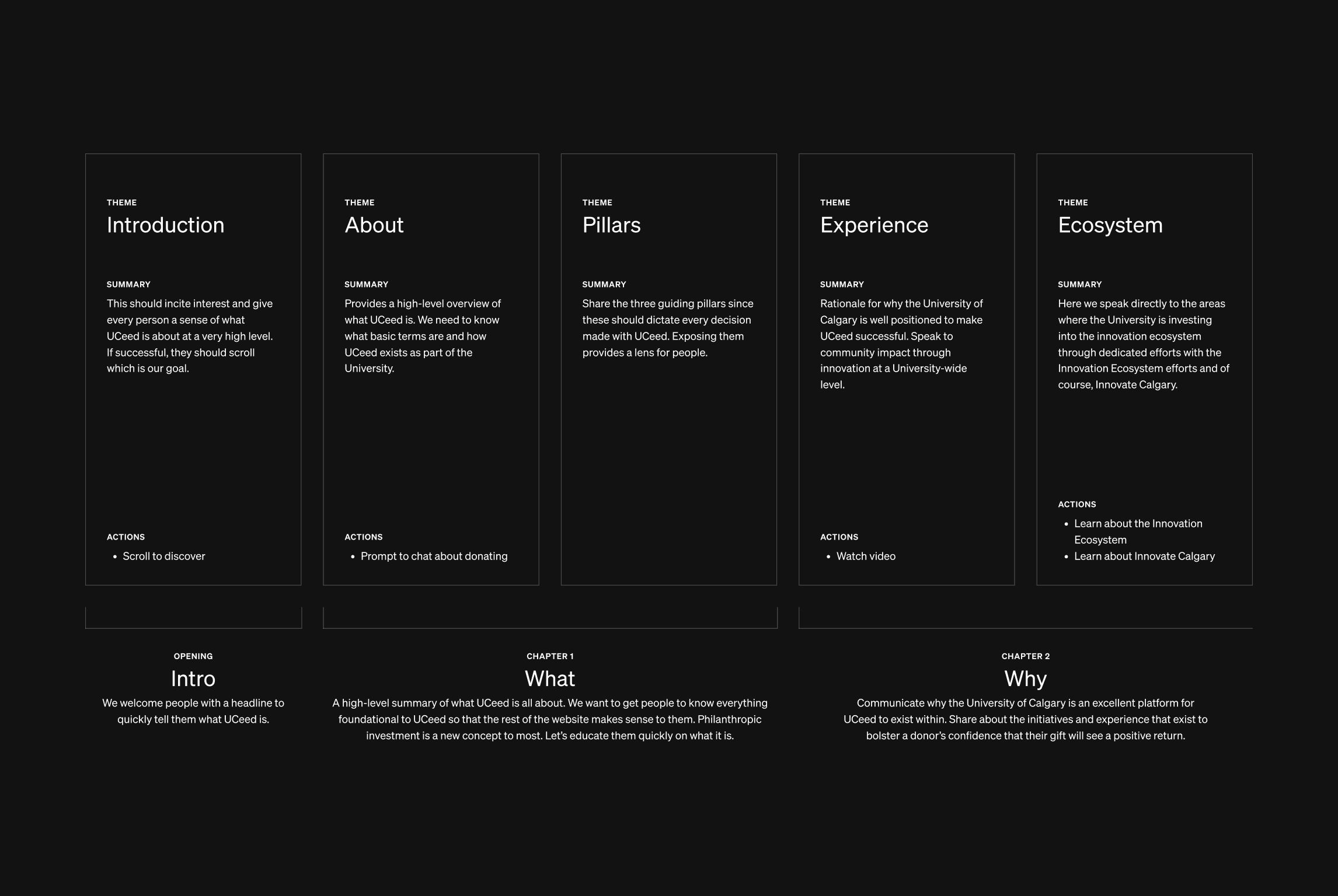 Our collaboration with the University of Calgary aimed to amplify the reach and impact of UCeed, making its benefits known to potential donors and the wider Calgary business community. To achieve this, we meticulously crafted a digital storytelling experience that mirrors the journey prospective donors undergo when introduced to UCeed by a fund manager. This involved breaking down the UCeed proposition into digestible sections and chapters, each tailored to convey part of the UCeed story compellingly and coherently online.